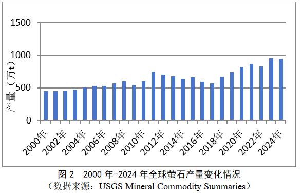 2000年-2024年全球螢石產(chǎn)量變化情況見圖2。