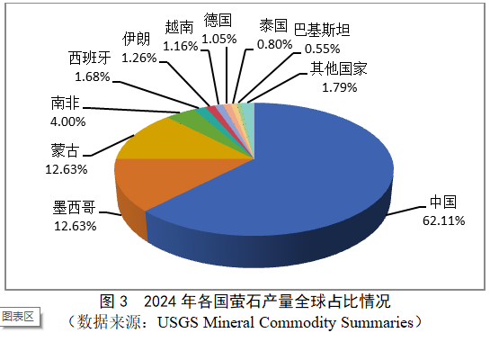 2024年,全球螢石產(chǎn)量約950萬t,與上一年基本持平。中國、墨西哥、蒙古、南非、西班牙和越南六國合計(jì)產(chǎn)量占全球總產(chǎn)量94.21%以上,其中,中國螢石產(chǎn)量位居第一,占全球總產(chǎn)量的62.11%。2024年各國螢石產(chǎn)量全球占比情況見圖3。