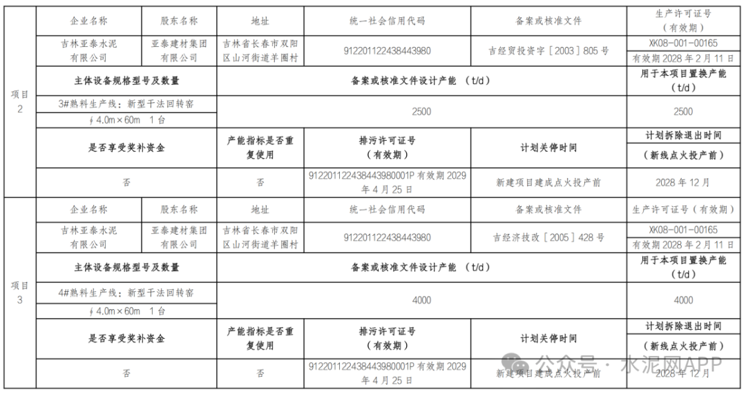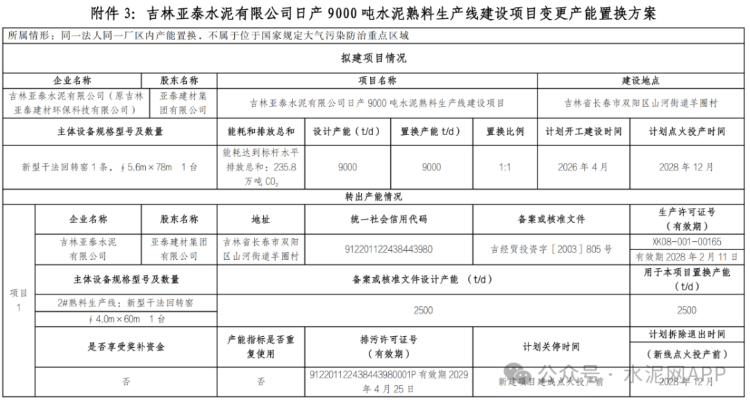3月13日,吉林省工信廳發(fā)布吉林亞泰水泥有限公司日產(chǎn)9000噸水泥熟料生產(chǎn)線建設(shè)項(xiàng)目變更產(chǎn)能置換方案的公示。結(jié)合新舊置換方案顯示,原建設(shè)主體由吉林亞泰建材環(huán)??萍加邢薰咀兏鼮榧謥喬┧嘤邢薰荆辉?jì)劃點(diǎn)火投產(chǎn)時(shí)間由2027年12月變更為2028年12月;置換產(chǎn)能退出時(shí)間由2027年12月變更為2028年12月。