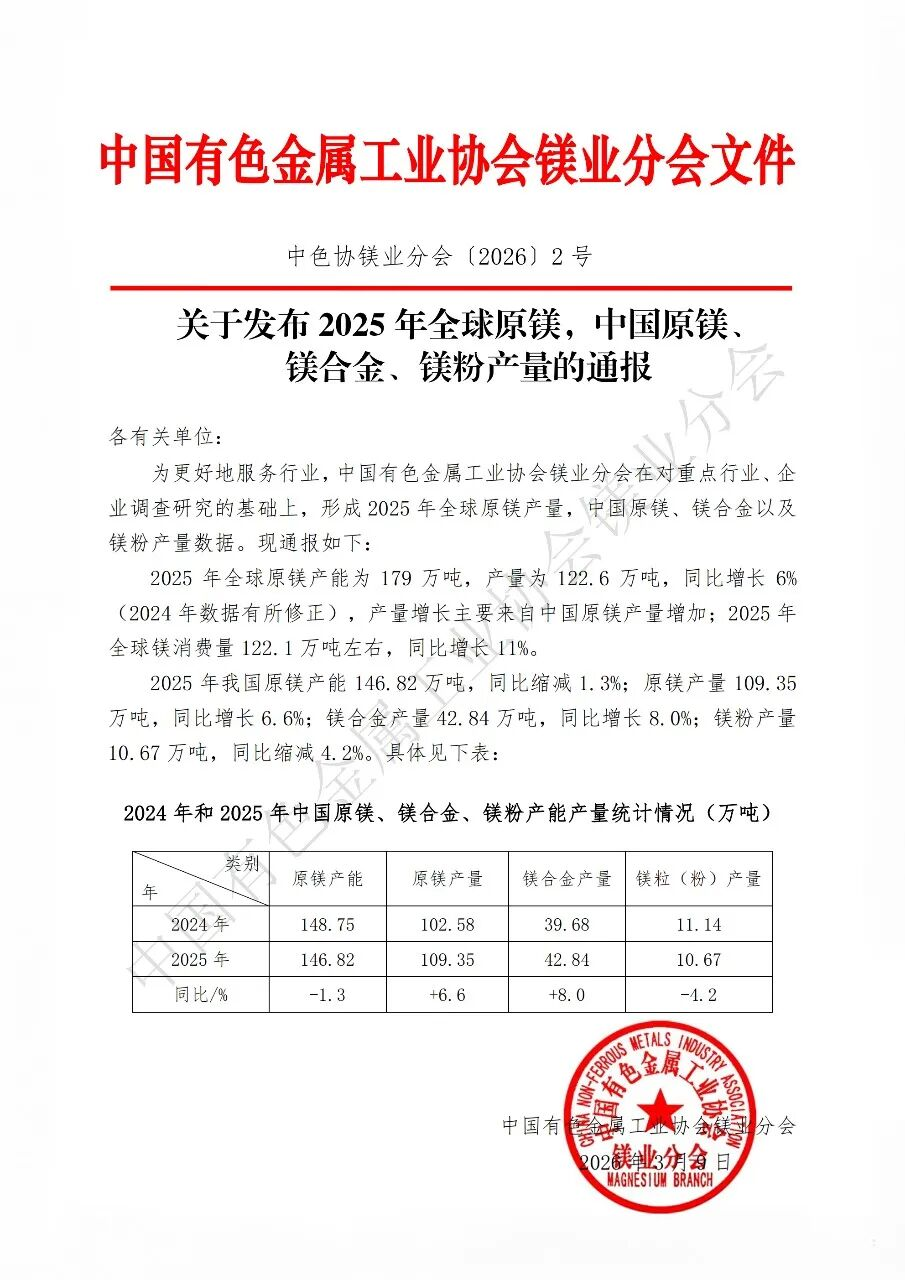 2026年3月9日,中國有色金屬工業(yè)協(xié)會鎂業(yè)分會正式發(fā)布《2025年全球原鎂、中國原鎂、鎂合金、鎂粉產(chǎn)量通報》,完成全球及中國鎂產(chǎn)業(yè)運行數(shù)據(jù)的年度更新與歷史修正。